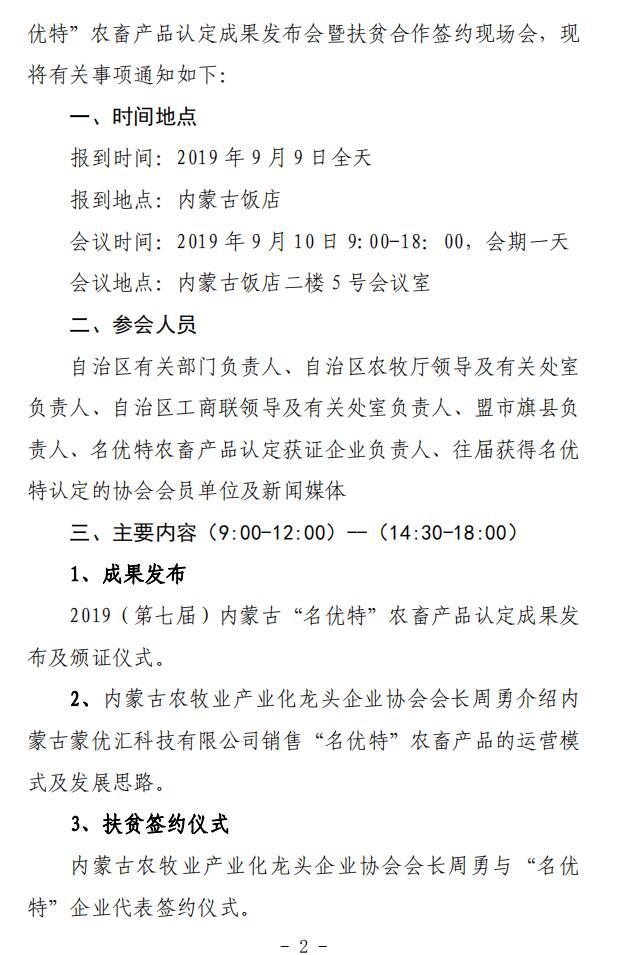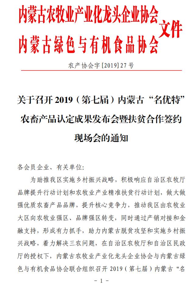 標題:關(guān)于召開(kāi) 2019(第七屆)內蒙古“名優(yōu)特” 農畜產(chǎn)品認定成果發(fā)布會(huì )暨扶貧合作簽約 現場(chǎng)會(huì )的通知