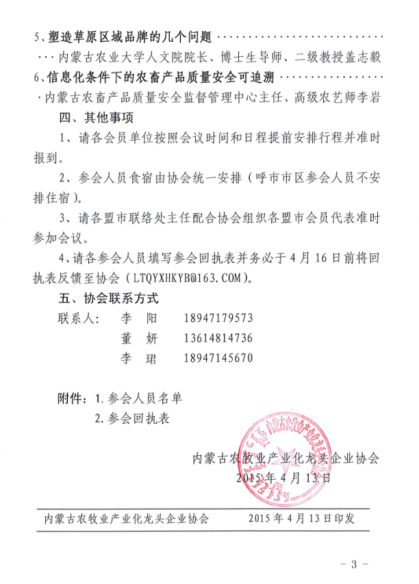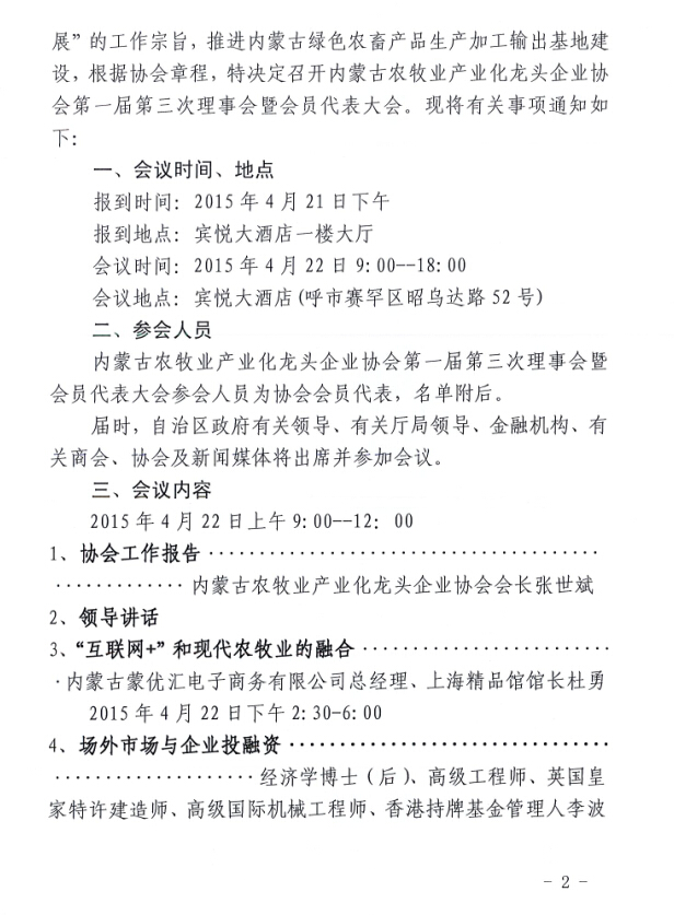 關(guān)于召開(kāi)內蒙古農牧業(yè)產(chǎn)業(yè)化龍頭企業(yè)協(xié)會(huì )第一屆第三次理事會(huì )暨會(huì )員代表大會(huì )的通知
