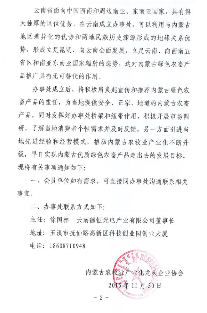 關(guān)于成立內蒙古農牧業(yè)產(chǎn)業(yè)化龍頭企業(yè)協(xié)會(huì )云南辦事處的通知