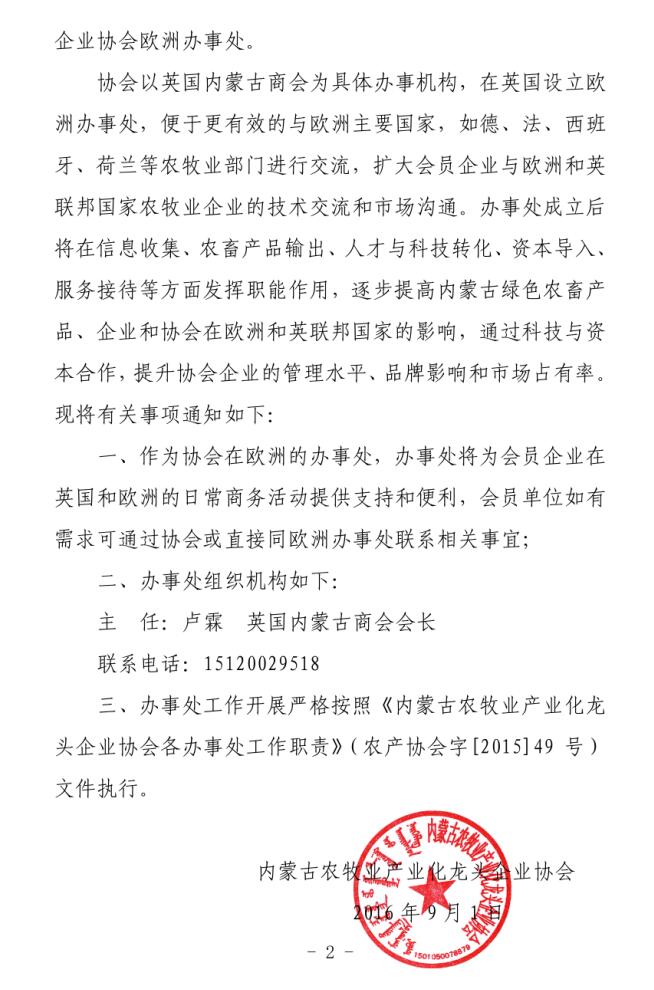 關(guān)于成立內蒙古農牧業(yè)產(chǎn)業(yè)化龍頭企業(yè)協(xié)會(huì )歐洲辦事處的通知