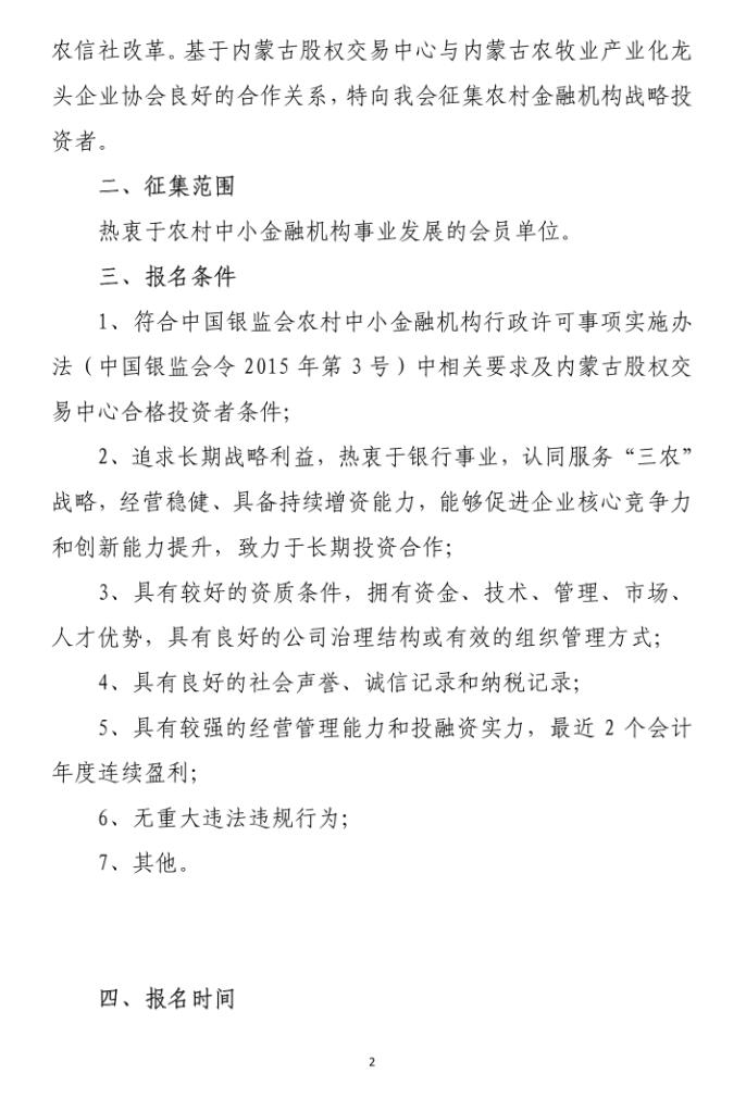 關(guān)于征集內蒙古農村銀行金融機構戰略投資者的通知