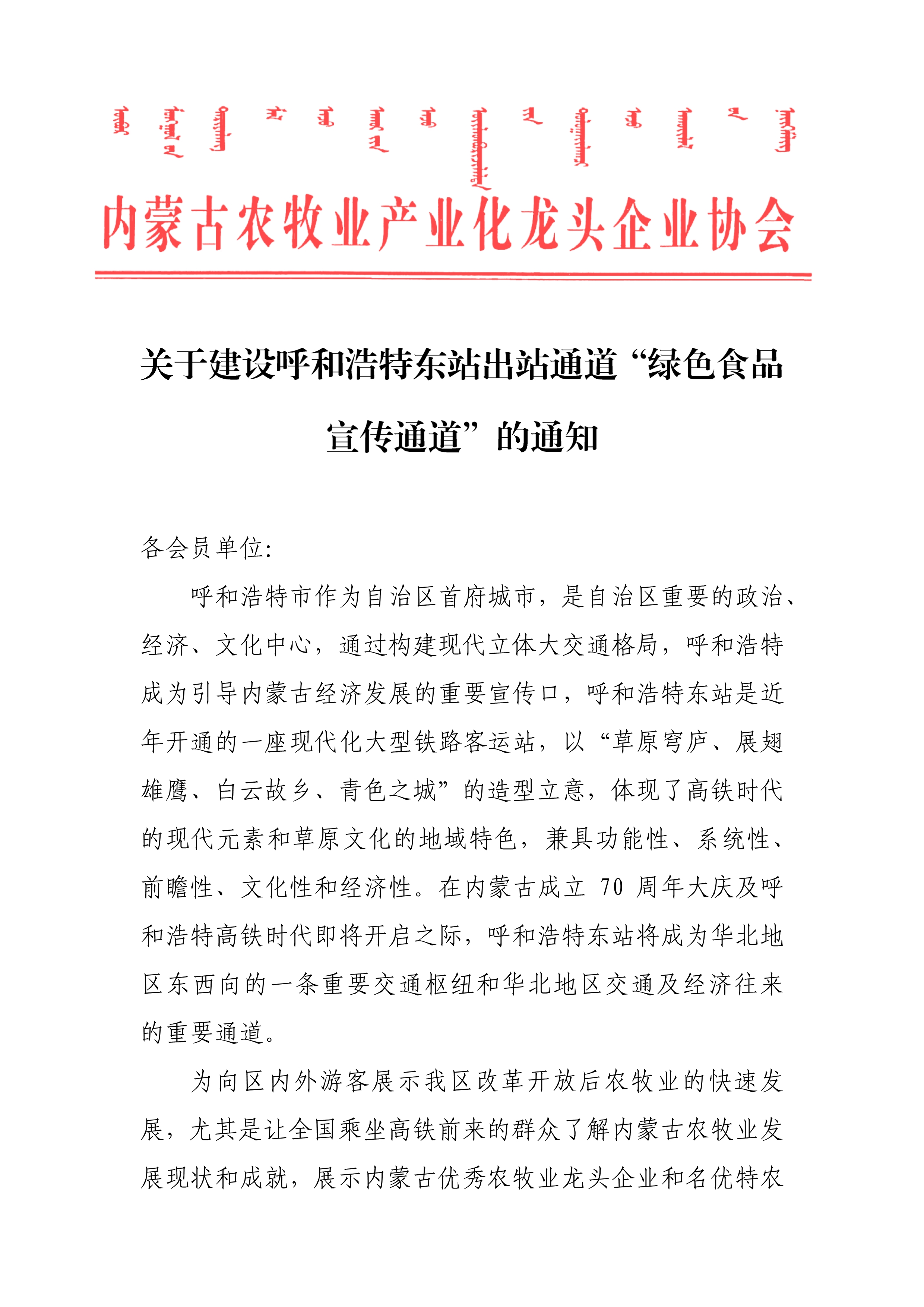 關(guān)于建設呼和浩特市東站出站通道“綠色食品宣傳通道”的通知