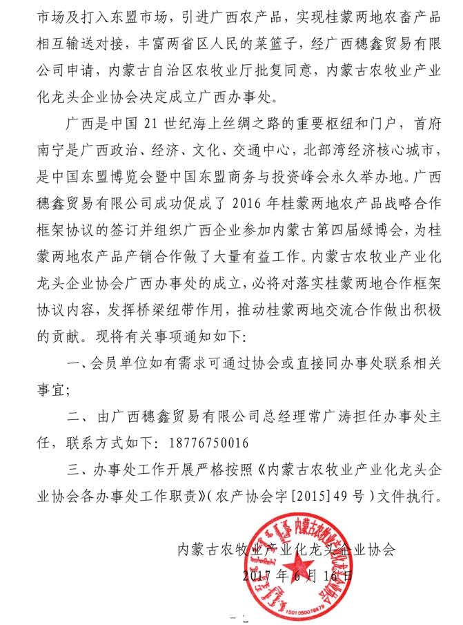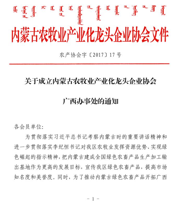 關(guān)于成立內蒙古農牧業(yè)產(chǎn)業(yè)化龍頭企業(yè)協(xié)會(huì )廣西辦事處的通知