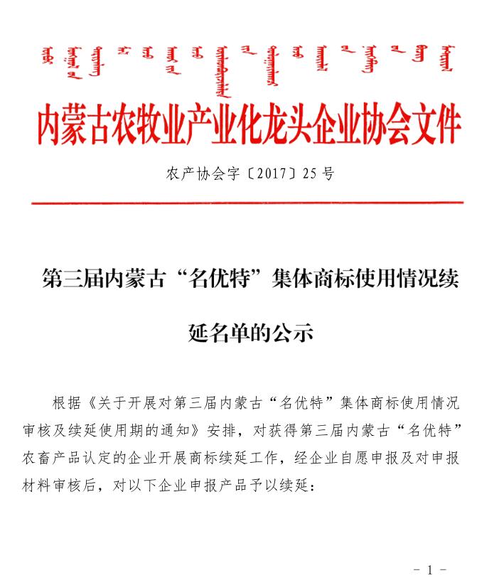 第三屆內蒙古“名優(yōu)特”集體商標使用情況續延名單的公示