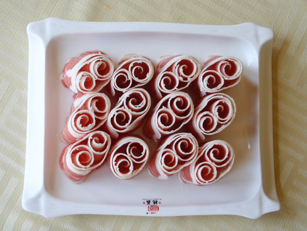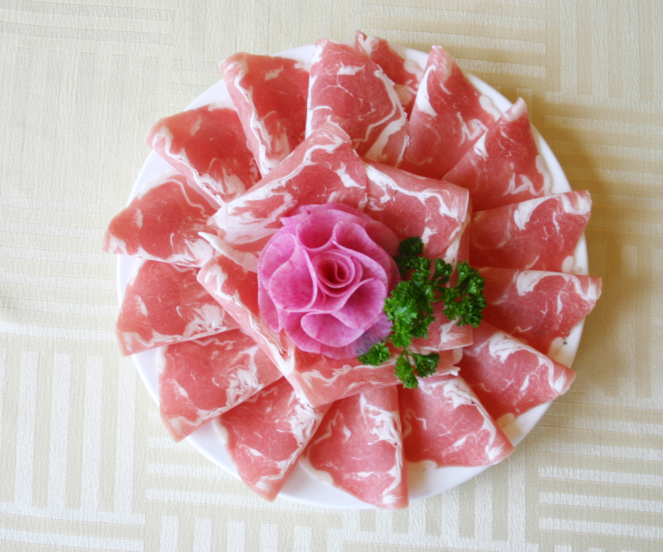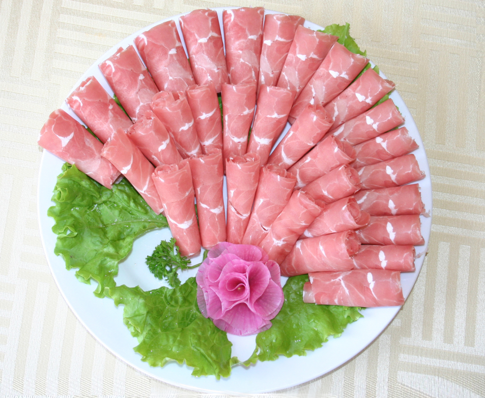 七、   杜泊羊肉卷:選用原料:采用南非引進(jìn)的杜伯羊,經(jīng)過(guò)雜交改良的品種。肉中脂肪分布均勻,胴體品質(zhì)高。經(jīng)選修之后,全部按照肥瘦搭配制成羊肉卷。一涮即熟、就涮不老。