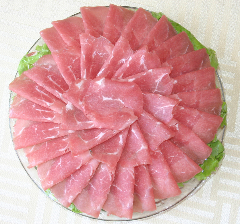 十四、精卷:選用原料:精選后的上腦、前腿、后腿,按肉紋方向一致、肥瘦搭配均勻后,卷制而成。外表美觀(guān),上盤(pán)后漂亮。