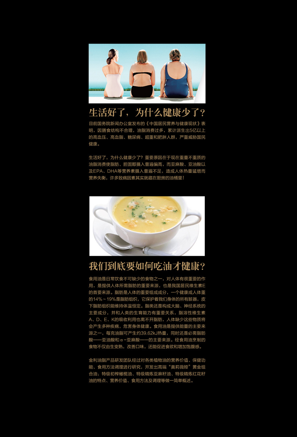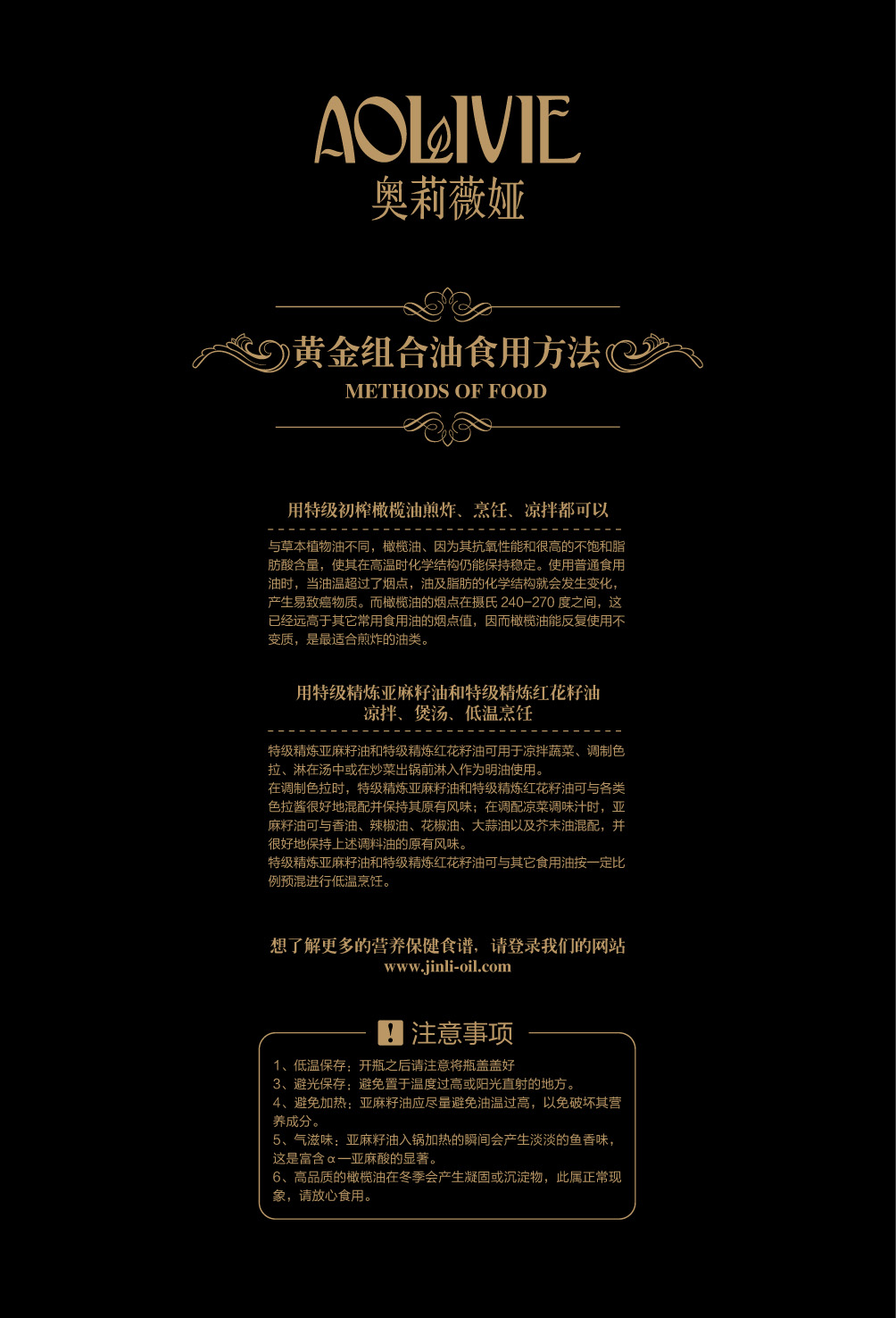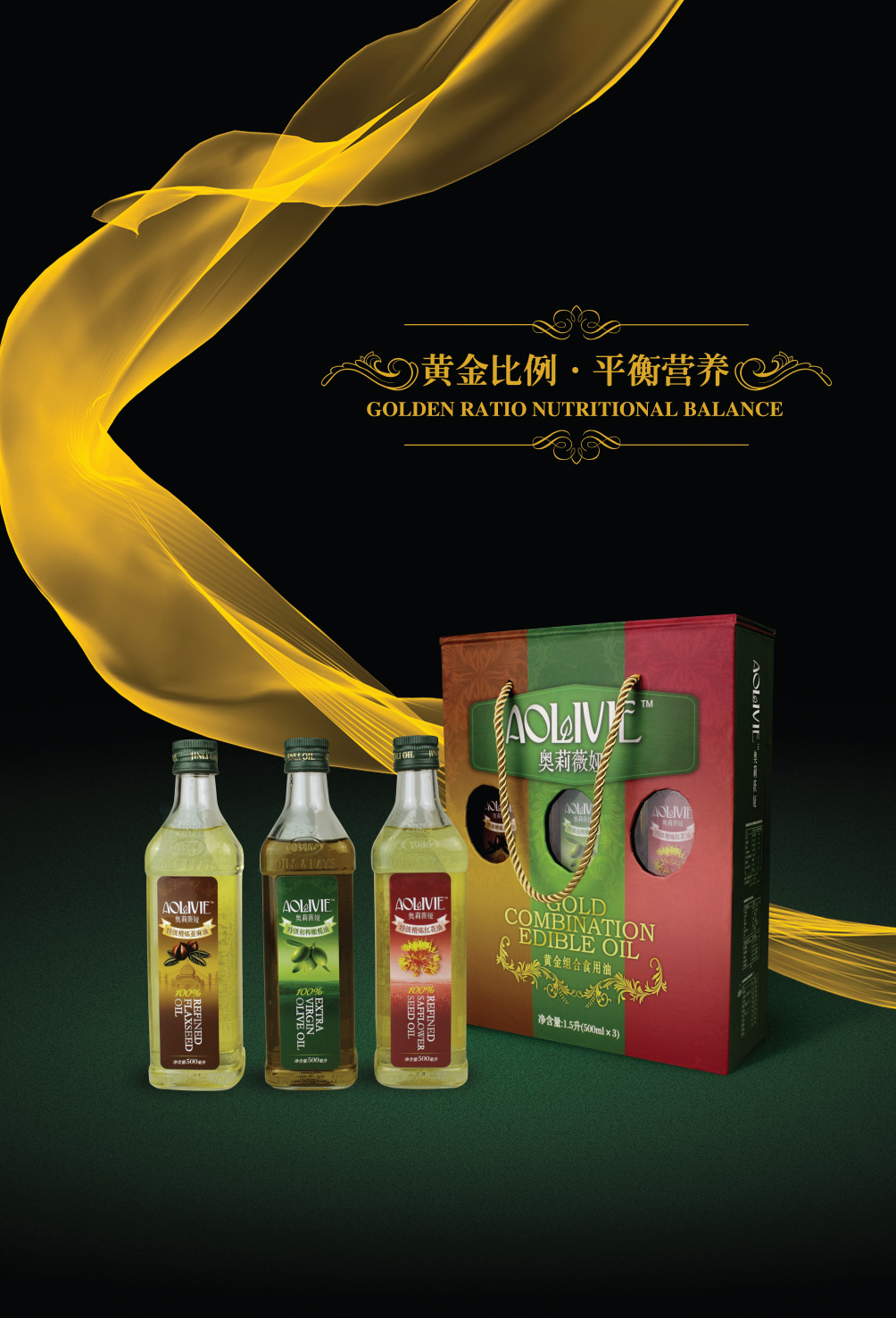 金利油脂(蘇州)有限公司研發(fā)的:“奧莉薇婭黃金組合植物營(yíng)養油,有各具特色的脂肪酸植物油組合而成,將各種油品進(jìn)行優(yōu)勢互補,科學(xué)的根據人體營(yíng)養需求,精心研制出的高端油脂系列產(chǎn)品。具有促進(jìn)大腦發(fā)育/增強視力/降脂/降血壓/抗血栓/保護前列腺/促進(jìn)脂肪代謝/抗衰老等良好的保健作用。為您均衡營(yíng)養/增強體質(zhì)而“加油”?!皧W莉薇婭黃金組合油,是有特級初榨橄欖油/特級冷榨亞麻籽油/特級精煉紅花籽油三種油品組成,其中單不飽和脂肪酸/α—亞麻酸和亞油酸,是所有植物油中含量最高植物營(yíng)養油。