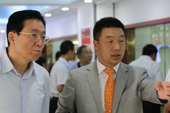 自治區農牧業(yè)廳副廳長(cháng)云挨厚(左一)在蒙羊牧業(yè)總裁閆樹(shù)春的陪同下參觀(guān)考察生產(chǎn)線(xiàn)