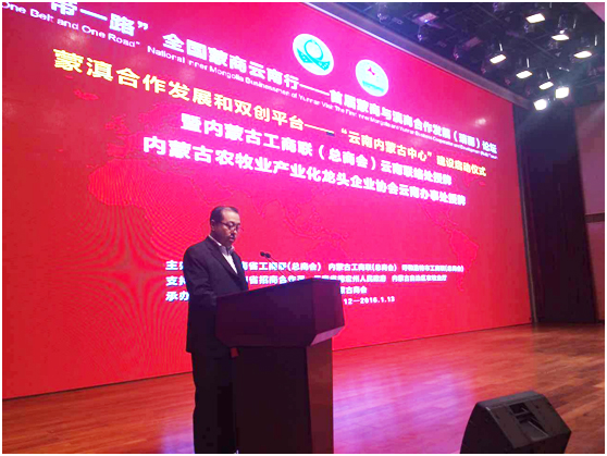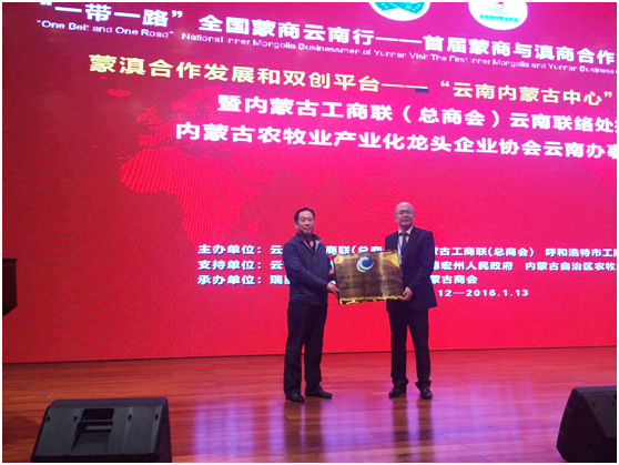 論壇上,蒙滇合作發(fā)展和雙創(chuàng )平臺——“云南內蒙古中心”建設啟動(dòng)儀式暨內蒙古工商聯(lián)(總商會(huì ))云南聯(lián)絡(luò )處授牌、內蒙古農牧業(yè)產(chǎn)業(yè)化龍頭企業(yè)協(xié)會(huì )云南辦事處授牌儀式同期舉行。內蒙古農牧業(yè)廳黨組成員、總農藝師王雨峰授予云南省內蒙古商會(huì )“內蒙古農牧業(yè)產(chǎn)業(yè)化龍頭企業(yè)協(xié)會(huì )云南辦事處”的牌匾,內蒙古農牧業(yè)產(chǎn)業(yè)化龍頭企業(yè)協(xié)會(huì )執行會(huì )長(cháng)林永亮宣讀辦事處成立文件,由云南省內蒙古商會(huì )會(huì )長(cháng)徐國林擔任辦事處主任。