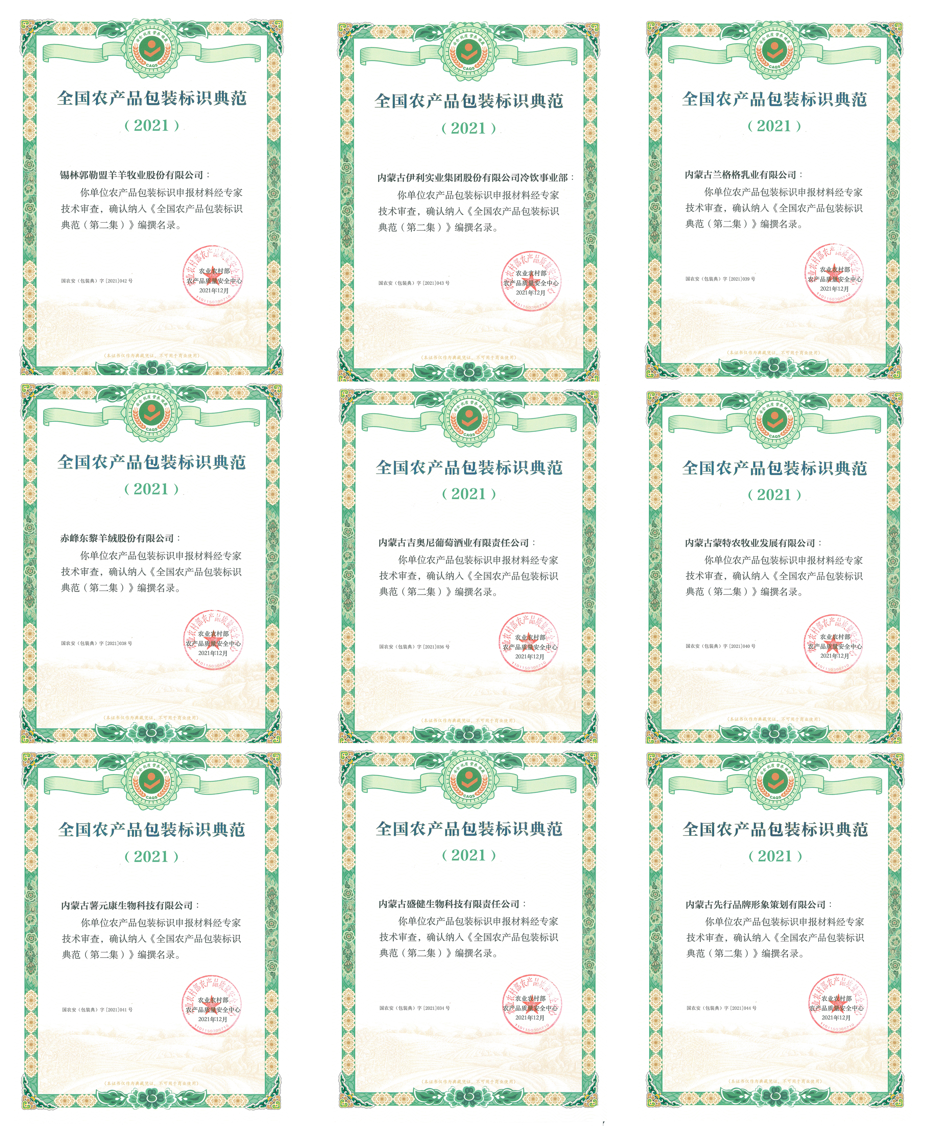 為幫助企業(yè)樹(shù)立品牌意識,逐步提升我區農畜產(chǎn)品的包裝水平和檔次,在內蒙古自治區農畜產(chǎn)品質(zhì)量安全中心的指導下,內蒙古農牧業(yè)產(chǎn)業(yè)化龍頭企業(yè)協(xié)會(huì )、內蒙古綠色與有機食品協(xié)會(huì )已于2021年10月,順利完成“第六屆內蒙古包裝設計競賽”的評選和表彰工作。為了更好的宣傳展示內蒙古優(yōu)質(zhì)農畜產(chǎn)品的品牌形象,由內蒙古自治區農畜產(chǎn)品質(zhì)量安全中心推薦,經(jīng)國家農安中心組織專(zhuān)家評審,有9家經(jīng)協(xié)會(huì )評選的包裝設計企業(yè)成功納入《2021年全國農產(chǎn)品包裝標識典范名錄》。據了解,入選目錄的企業(yè),經(jīng)授權,可以在審定的包裝上使用其中心標識。
