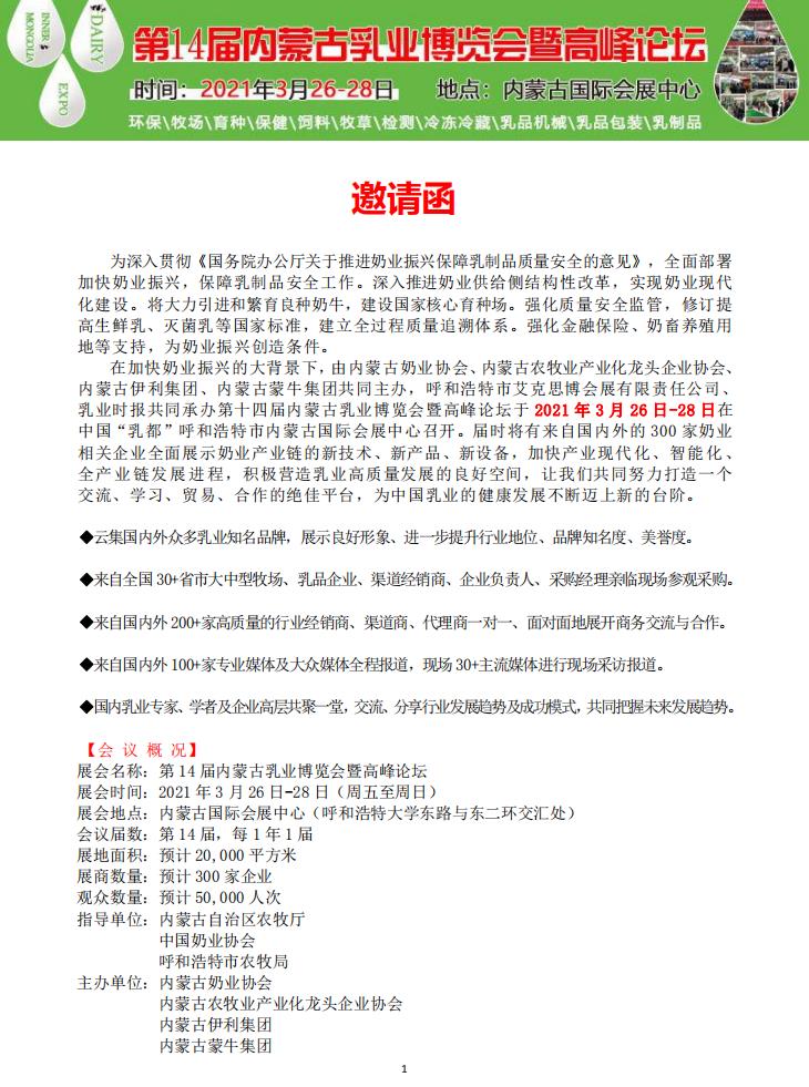 第14屆內蒙古乳業(yè)博覽會(huì )暨高峰論壇邀請函