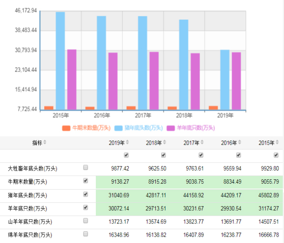 全國2015-2019年牛、羊、豬產(chǎn)量情況