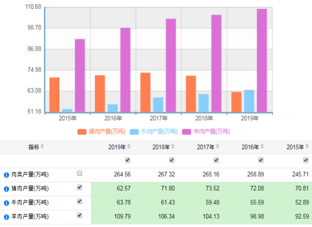 內蒙古2015-2019年肉豬、肉羊、肉牛產(chǎn)量情況