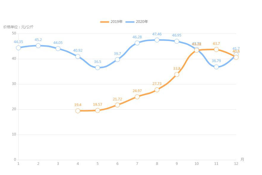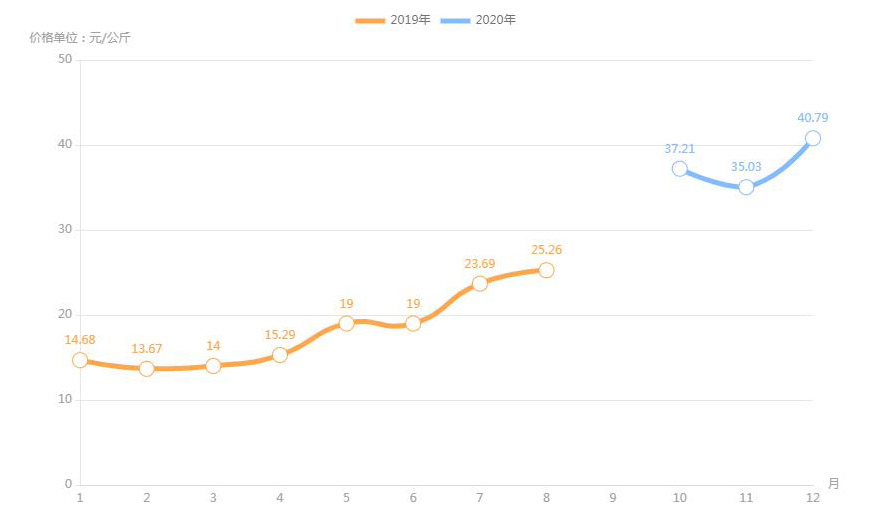 豬肉(白條豬)最高價(jià)格出現在2020年12月40.79元/公斤,最低價(jià)格出現在2019年2月13.67元/公斤。