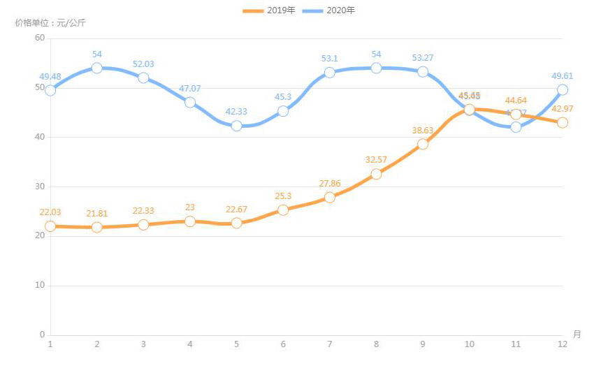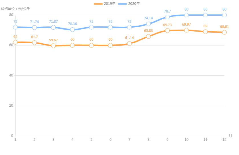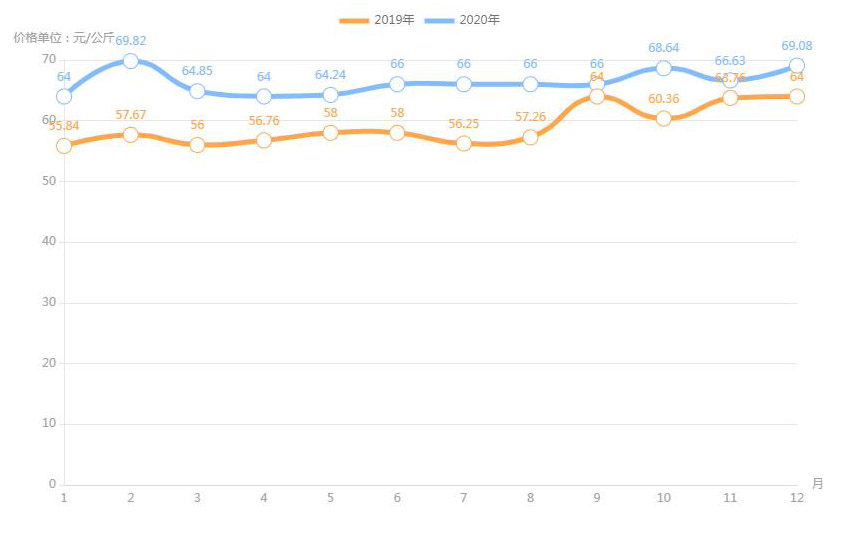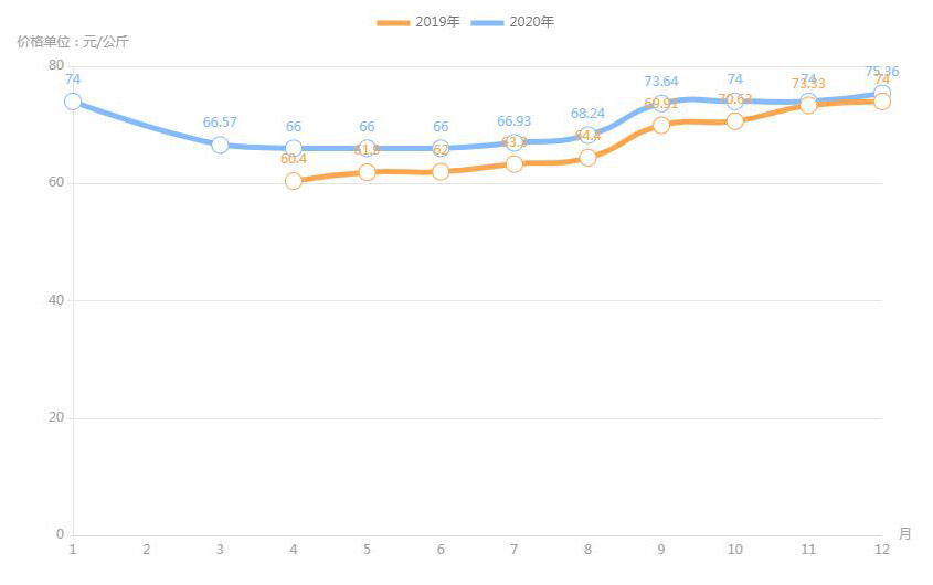 農業(yè)農村部對全國500個(gè)集貿市場(chǎng)監測,2020年12月第二周,全國羊肉價(jià)格為每公斤82.66元,連續八周上漲,同比上漲3.6%。業(yè)內人透露,目前,養羊成本上升;人們對羊肉品質(zhì)的要求也越來(lái)越高,消費者更加傾向于選擇有質(zhì)量認證標志和品牌的羊肉產(chǎn)品,特別是優(yōu)質(zhì)、味美的新鮮羊肉,加上羊肉產(chǎn)量不高,供應不足,拉動(dòng)了羊肉價(jià)格上漲。