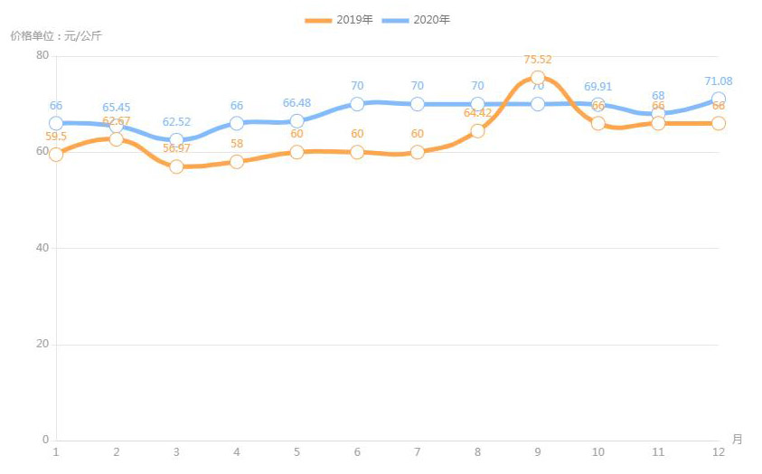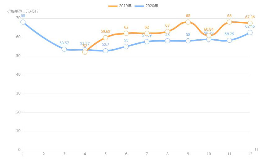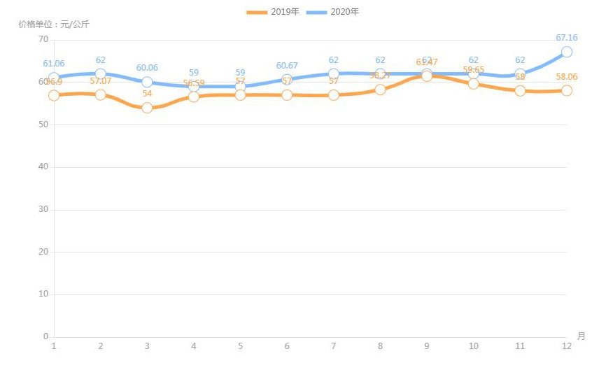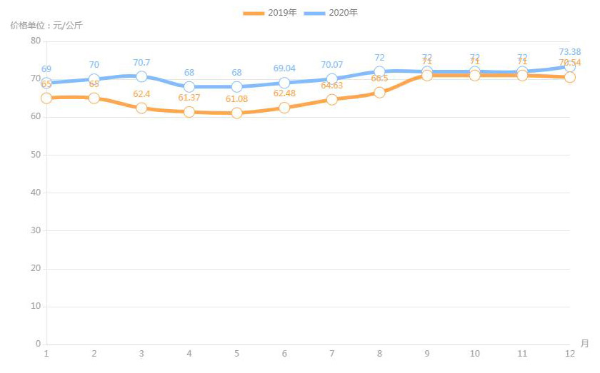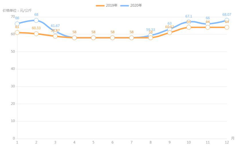 對內蒙古幾大農貿批發(fā)市場(chǎng)羊肉價(jià)進(jìn)行匯總分析得出:呼和浩特市內蒙古美通農產(chǎn)品批發(fā)市場(chǎng)羊肉最高價(jià)格出現在2020年11月68元/公斤,最低價(jià)格出現在2019年4月52元/公斤。呼和浩特市東瓦窯批發(fā)市場(chǎng)羊肉最高價(jià)格出現在2020年12月73.38元/公斤,最低價(jià)格出現在2019年5月61.08元/公斤。包頭市友誼蔬菜批發(fā)市場(chǎng)羊肉最高價(jià)格出現在2020年12月67.16元/公斤,最低價(jià)格出現在2019年3月54元/公斤。內蒙古赤峰西城市場(chǎng)羊肉最高價(jià)格出現在2019年9月75.52元/公斤,最低價(jià)格出現在2019年3月56.97元/公斤。羊肉價(jià)格和去年同期相比整體上漲,漲幅基本在每公斤5-15元左右。
